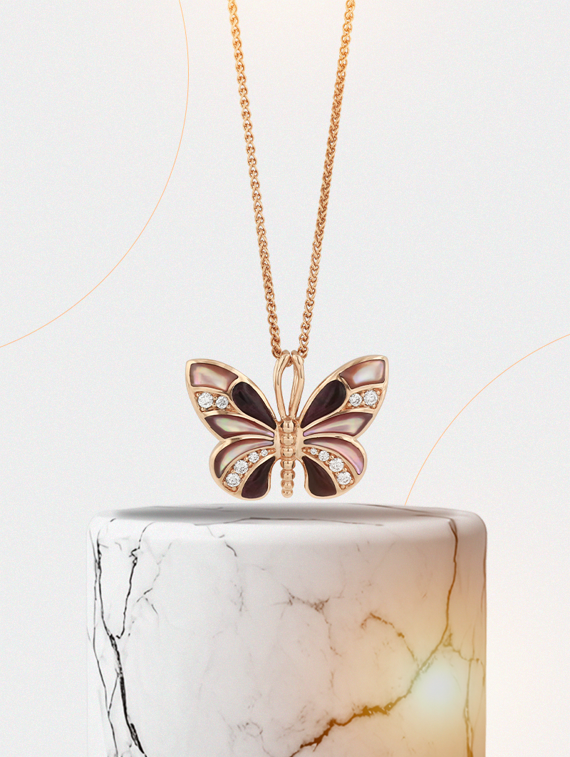 This 14KT Rose Gold Pendant combines Pink Mother of Pearl and Purple Spiny Oyster with shimmering .18ct diamonds. The radiant inlays create a striking play of color, while the diamond accents elevate its brilliance. A piece that embodies artistry, sophistication, and timeless charm.