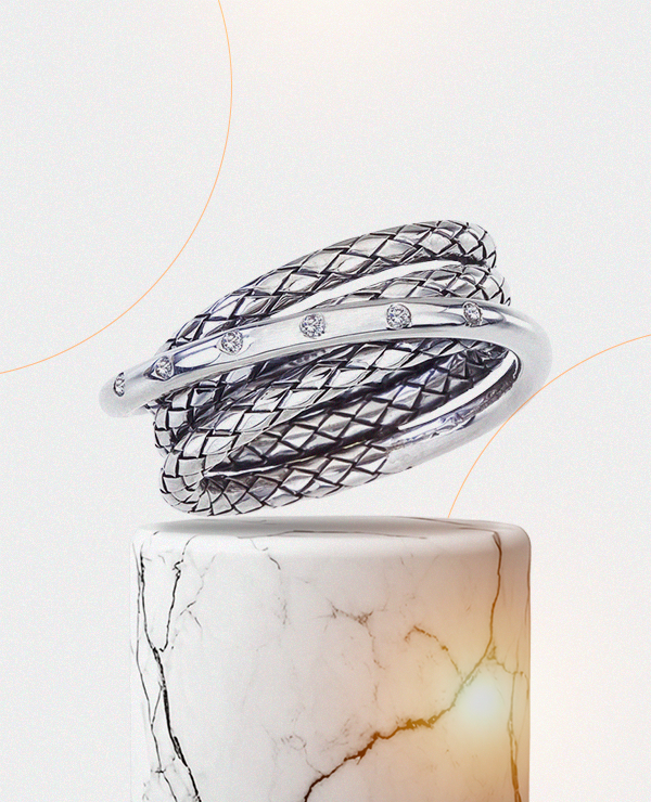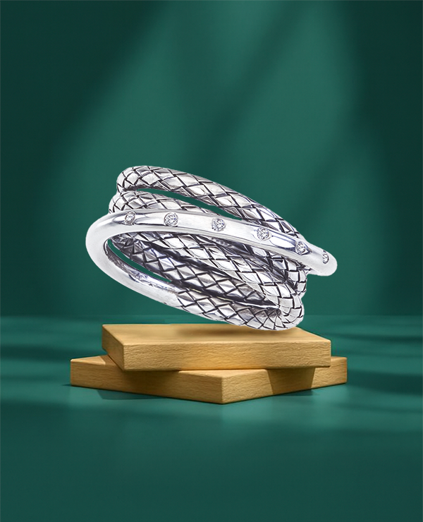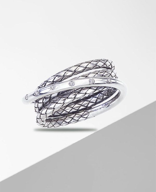 The 3 Row Sterling Traversa Band Ring with Diamonds in Shiny Crossover blends contemporary design with timeless sparkle. Crafted in rhodium-finished 925 sterling silver, it features overlapping polished tubes and 0.06ct pavé-set diamonds, offering brilliance, durability, and everyday elegance.