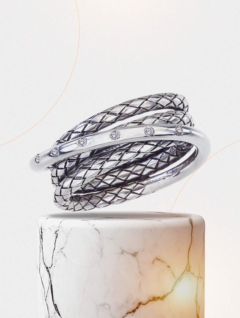Shiny overlapping tubes create depth, making this band both modern and eye-catching.