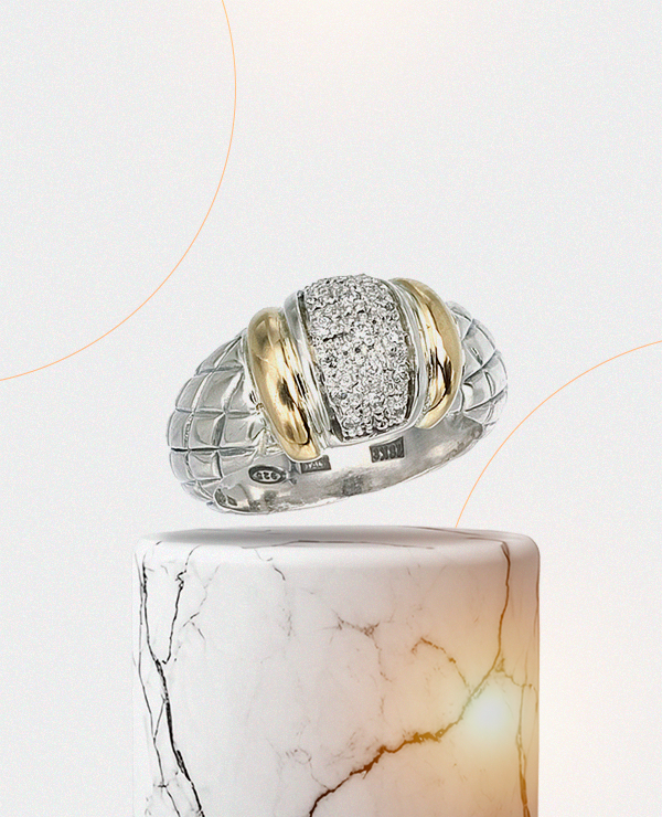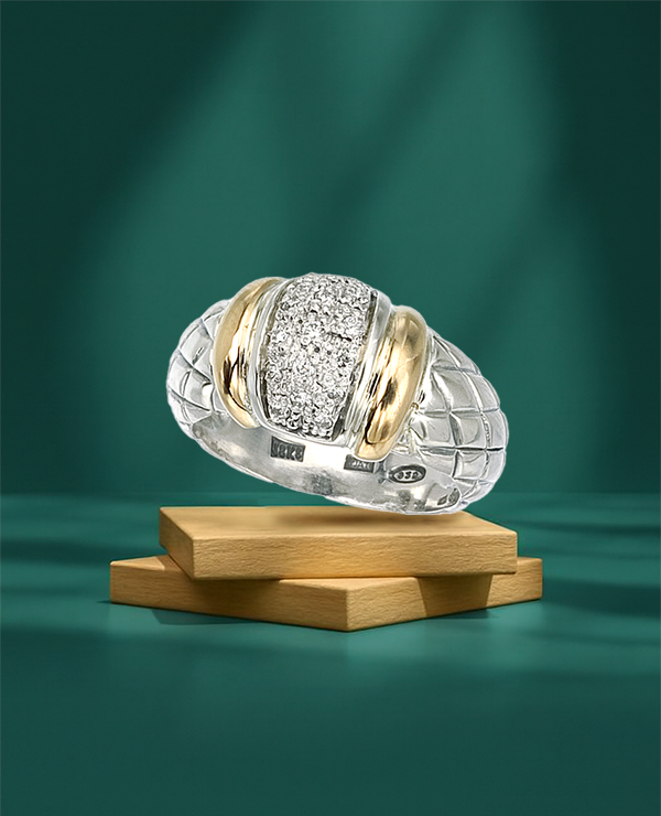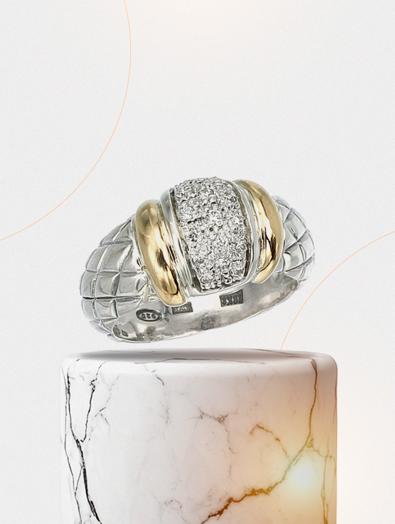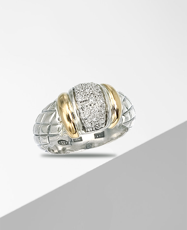 SKU: VHR-530D-TRAV Categories:All Products, Rings Tags:Diamond Dome Ring Pavé Set Diamonds Sterling Silver Ring Traversa Collection Two-Tone Jewelry Yellow Gold Accents Brand: Egons
